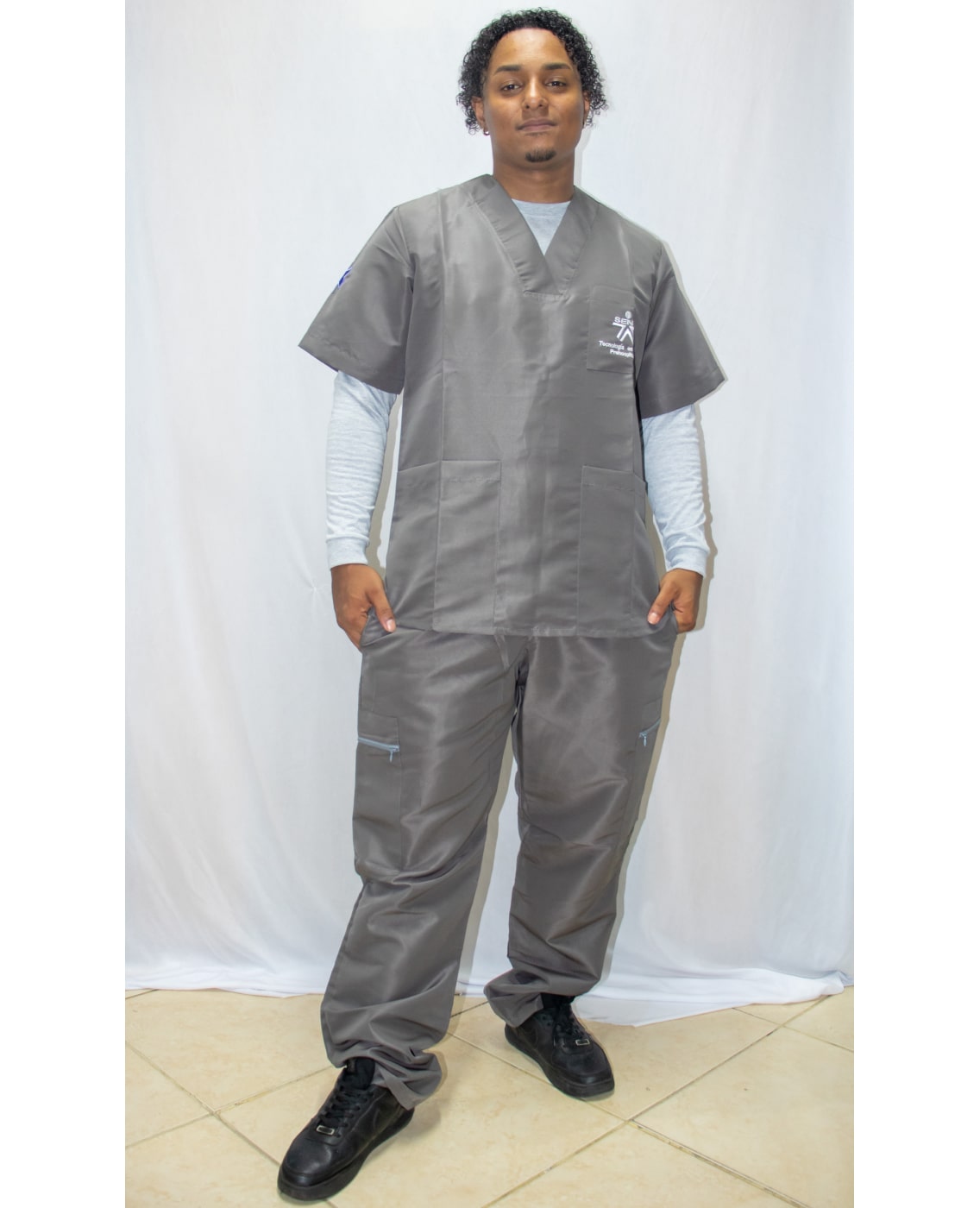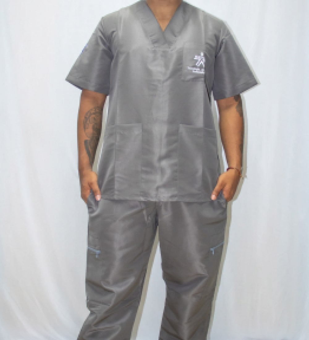 Cuello: Escote en V, Manga: Corta, Bota: Recta, Color: Gris, Material principal: Antifluido de Textilia 100% poliéster Tallas: Desde la talla XXS hasta la talla XXL